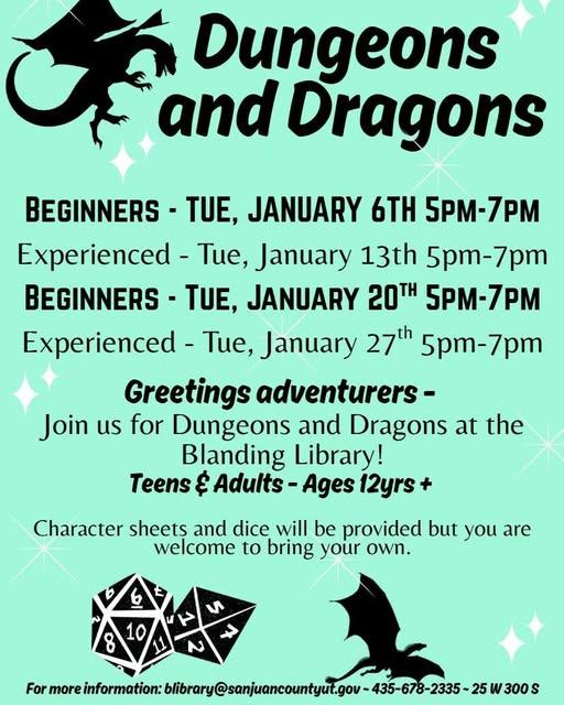 For more information: blibrary@sanjuancountyut.gov ~ 435-678-2335 ~ 25 W 300 S